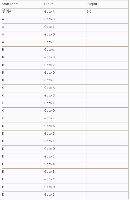 3. 玩家可以控制角色从一个房间走到另一个房间(敲入命令goto A,则进入A房间),每次只能走一步路径。起始房间为A