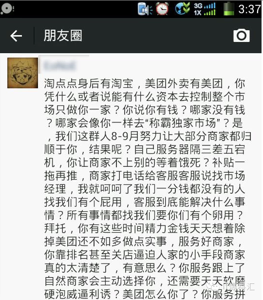 10月底的时候,有内部员工就在朋友圈大吐口水,吐槽饿了么的策略与企业文化。