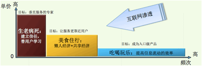 很多传统生活服务行业正被互联网渗透和改造,不论是嘀嘀、快的之类的打车软件,还是美团、饿了么之类的团购餐饮,都在以惊人的速度改变着我们的生活。马斯洛的需求层次理论阐明了人的需要从低级向高级发展的现象,与之相对应的,满足人们这些需求的生活服务也是分层次的。可以简单的概括为“ 吃喝玩乐”、“衣食住行”、“生老病死”三类 。