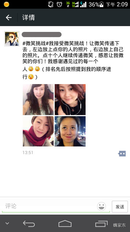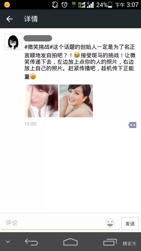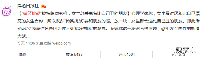 从微博上截图,据说:心理学家称,女生最讨厌和比自己漂亮的女生合影,所以既然“微笑挑战”要和朋友的照片放一块,女生都会选比自己丑的朋友。即此活动暗含“我点你名是因为你不如我好看哦”的意思。专家称这一秘密若被发现,恐引发全国性的撕逼大战。