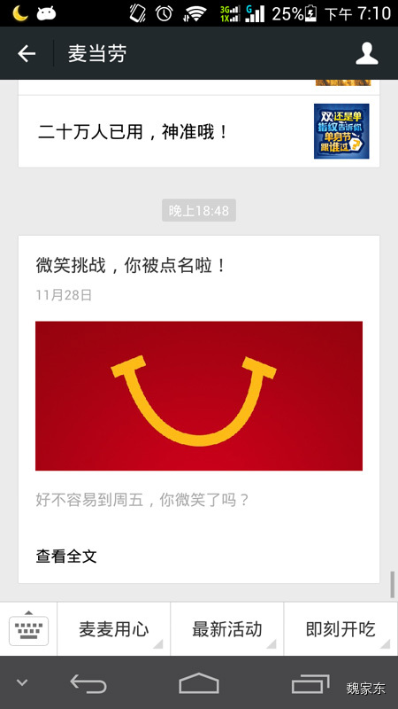 麦当劳的官方微信发了一个关于微笑挑战的微信,借势速度之快,应该赞一个。