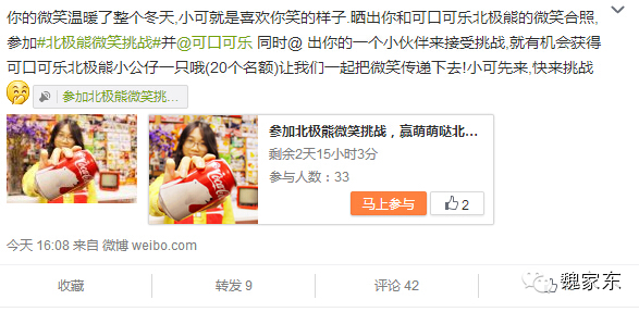 可口可乐官方微博也玩起了“微笑挑战”,活动是希望大家与北极熊瓶身可乐微笑合影,微博参与就可以。企业社会化传播,借势热点的速度很重要。